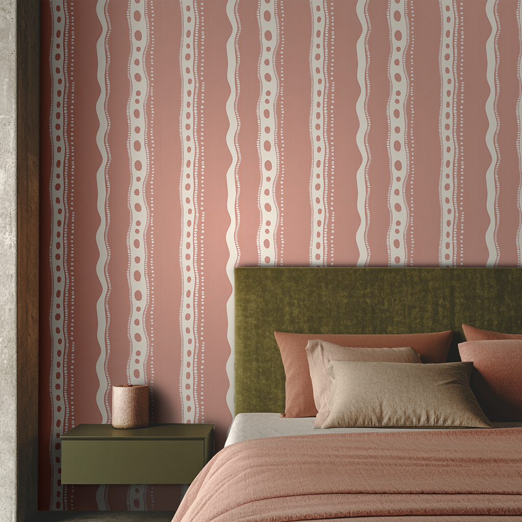 This playful new design brings an artistic, free-spirited vibe with its wavy ivory stripes and whimsical dot patterns set against a warm terracotta-pink background. The organic lines and bold shapes create a lively rhythm that's full of personality and charm.