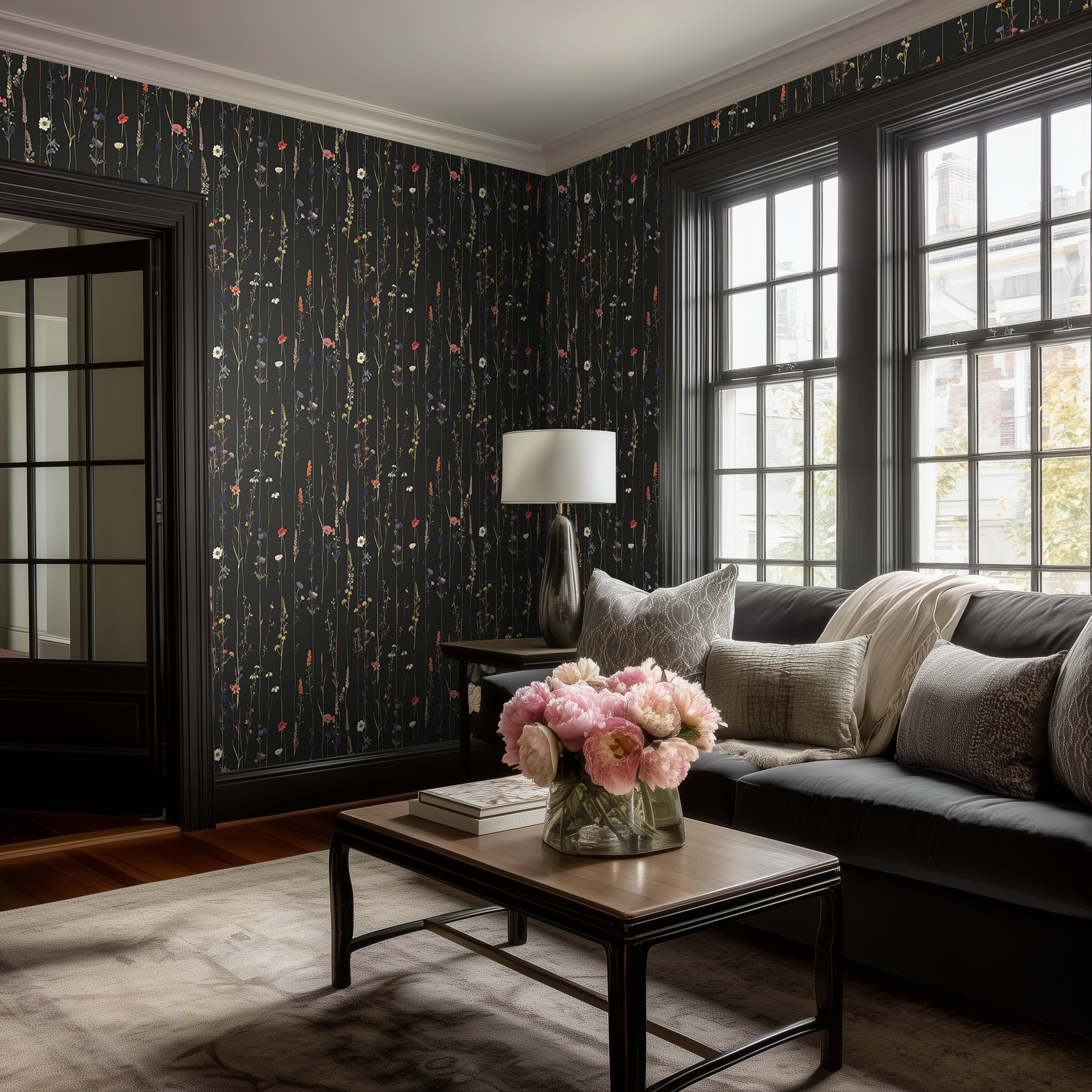Transform your space with the Emily Wallpaper, featuring delicate wildflowers in vibrant hues against a dramatic black background. This striking and elegant design adds a touch of sophistication and nature-inspired beauty to any room, perfect for creating a bold and stylish atmosphere.