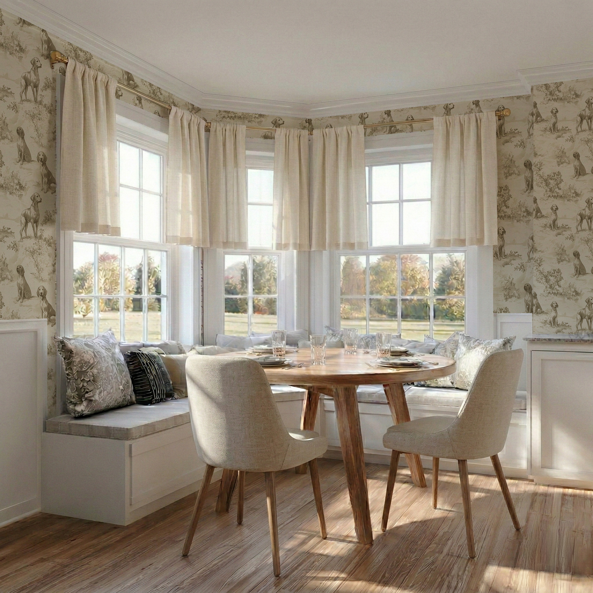 Field Day is a refined countryside classic, featuring noble sporting dogs in a soft, sepia-toned landscape. The detailed sketchwork and gentle tonal palette lend a timeless elegance to the pattern, making it both rustic and elevated. Perfect for studies, libraries, or hallways, it brings a serene, storybook charm to any space.