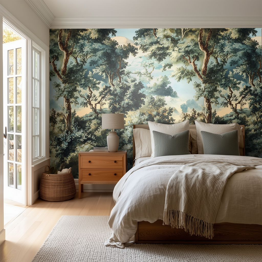 Bask in the dreamy glow of the Laocadie Wallpaper, a breathtaking wallpaper that captures the beauty of a sunlit forest. Soft watercolor tones of blue, green, and warm gold blend seamlessly, creating a sense of depth and tranquility. Perfect for brightening up living spaces, bedrooms, or entryways, this design brings the charm of a painted landscape into your home.