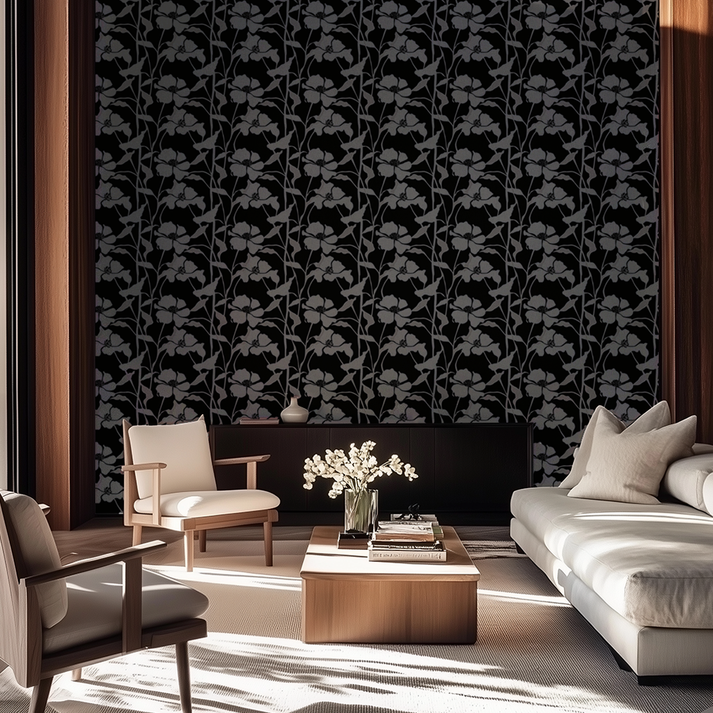 This dramatic new design makes a bold statement with its striking black background and elegant floral silhouette in soft gray tones. The high contrast and clean lines bring a modern, sophisticated edge to the space, while the floral motif keeps it grounded in nature