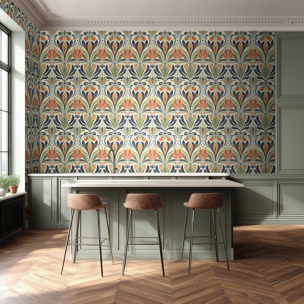 The "Nellie" wallpaper features a vibrant Art Nouveau-inspired design with symmetrical floral bursts in a palette of orange, green, and navy. This lively pattern is perfect for infusing any space with energy and a touch of retro charm, ideal for bold interiors that celebrate color and historic design elements.