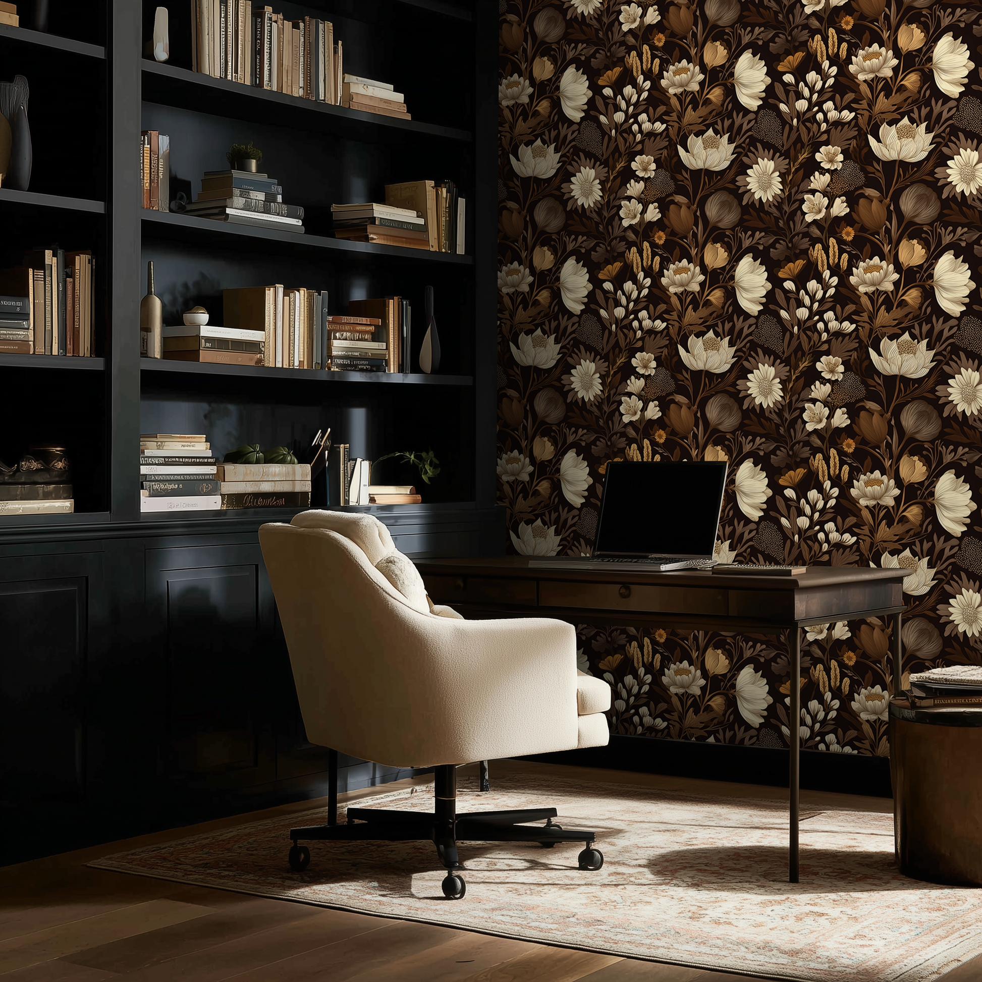 Sepia Sonata blends vintage charm with natural elegance, showcasing florals in creamy whites, warm ochres, and soft browns against a rich espresso background. The muted palette and delicate linework create a nostalgic, botanical feel; perfect for cozy living spaces, entryways, or anywhere you want a subtle yet striking statement.