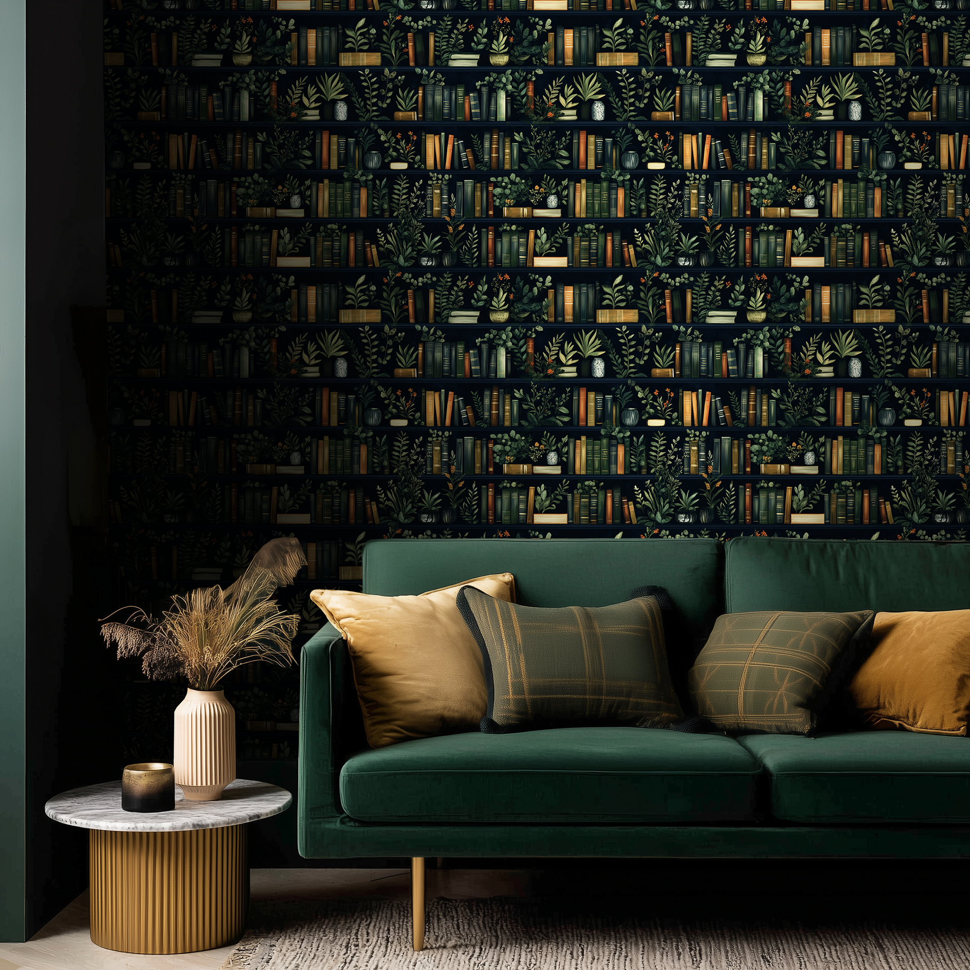 A dramatic and lush design, the Valentina wallpaper features dark bookshelves intertwined with trailing greenery and delicate florals. Its rich tones and intricate detailing evoke a moody, enchanted library setting. Ideal for those who love a gothic yet sophisticated aesthetic, this wallpaper transforms any space into a hidden literary retreat. Whether used as an accent wall or throughout a room, it adds depth, intrigue, and undeniable charm.